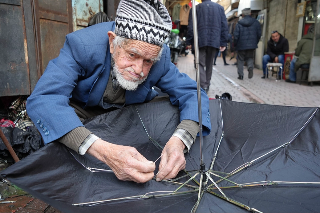 Dursun Yıldız, Samsun’un Bedesten Çarşısı’nda yaklaşık 70 yılı aşkın süredir esnaflık yapıyor. 94 yaşında olmasına rağmen sağlığı gayet yerinde olan Yıldız, büyük bir aşkla mesleğini icra ediyor. Mesleğinin Samsun’daki son temsilcisi olan 4 çocuk babası Yıldız, yaşıtlarına taş çıkarır bir vaziyette gözlüksüz olarak ipliği iğneye geçirip günde onlarca şemsiye tamir ediyor. Vatandaşlar kendilerine sıra gelmesi için 94 yaşındaki Dursun Yıldız’ın başında sıra bekliyorlar.