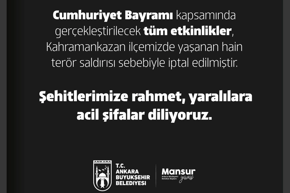 ABB'den yapılan açıklamada, "Cumhuriyet Bayramı kapsamında gerçekleştirilecek olan tüm etkinlikler, Kahramankazan ilçemizde gerçekleşen hain terör saldırısı sebebiyle iptal edilmiştir. Şehitlerimize rahmet, yaralılarımıza acil şifalar diliyoruz" ifadelerine yer verildi.