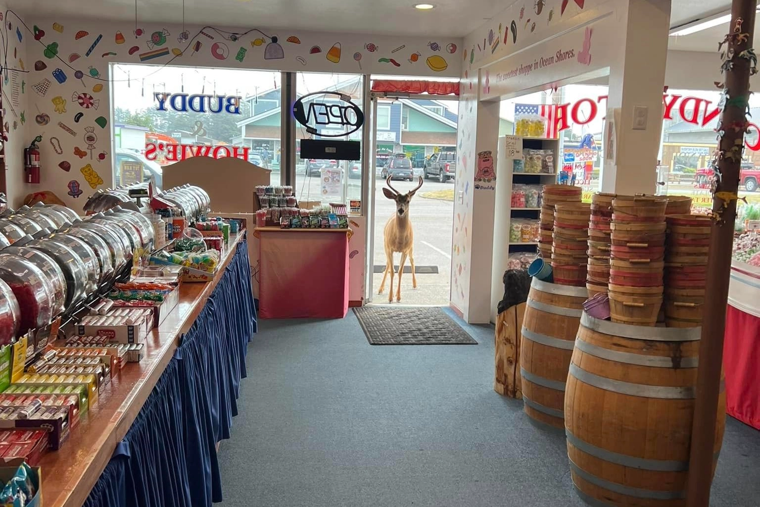 ABD’nin Washington eyaletindeki Ocean Shores kentinde yer alan bir şekerci dükkanı bu kez farklı bir ziyaretçiyi ağırladı. Buddy and Howies adlı şekerci dükkanına giren geyiğin kısa ziyareti gülümsetti. O anlara ait güvenlik kamerası görüntülerinde, geyiğin yavaşça etrafa bakındıktan sonra dükkanın kapısından içeri girdiği ve tezgahların etrafında kısa bir tur atıp şekerleri kokladığı görülüyor. Dükkanda bulunanların kendisine yaklaşmasıyla ürken sevimli hayvan, bir tane şeker aldıktan sonra kaçıp uzaklaşıyor.