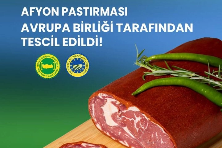 Afyon Pastırması, Avrupa Birliği'nde tescillenen 34'üncü coğrafi işaretli ürünümüz oldu" dedi. Sanayi ve Teknoloji Bakanı Mehmet Fatih Kacır, sosyal medya hesabından uluslararası coğrafi işaret tescilleri ile ilgili paylaşım yaptı. Bakan Kacır, Avrupa Birliği'nde tescillenen 34'üncü coğrafi işaretli ürünün 'Afyon Pastırması' olduğunu açıkladı. Yaptığı paylaşımda ise Bakan Kacır şu ifadelere yer verdi: "Uluslararası coğrafi işaret tescillerimize bir yenisini ekledik. Afyon Pastırması, Avrupa Birliği'nde tescillenen 34'üncü coğrafi işaretli ürünümüz oldu. Coğrafi işaretli ürünlerimiz kadim kültürümüzün, bereketli topraklarımızın ve üreticilerimizin emeğinin küresel ölçekte tescilidir. Başta üreticilerimiz olmak üzere emeği geçen herkesi yürekten kutluyorum. Anadolu'nun değerlerini koruyup dünyaya tanıtmaya devam edeceğiz." Aynı zamanda paylaşımın devamında Avrupa Birliği'nde tescilli coğrafi işaretli ürünlere yer verildi. Tescilli coğrafi işaretli ürünlerin sırası ise şu şekilde: "Gaziantep Baklavası, Aydın İnciri, Malatya Kayısısı, Aydın Kestanesi, Milas Zeytinyağı, Bayramiç Beyazı, Taşköprü Sarımsağı, Giresun Tombul Fındığı, Antakya Künefesi, Suruç Narı, Çağlayancerit Cevizi, Gemlik Zeytini, Edremit Zeytinyağı, Milas Yağlı Zeytini, Ayaş Domatesi, Maraş Tarhanası, Edremit Körfezi, Yeşil Çizik Zeytini, Ezine Peyniri, Safranbolu Safranı, Aydın Memecik Zeytinyağı, Araban Sarımsağı, Osmaniye Yer Fıstığı, Bingöl Balı, Bursa Şeftalisi, Hüyük Çileği, Bursa Siyah İnciri, Söke Pamuğu, Manisa Mesir Macunu, Gaziantep Menengiç Kahvesi, Silifke Yoğurdu, Aydın Memecik Zeytini, Erzincan Tulum Peyniri, Aydın Çam Fıstığı, Afyon Pastırması."