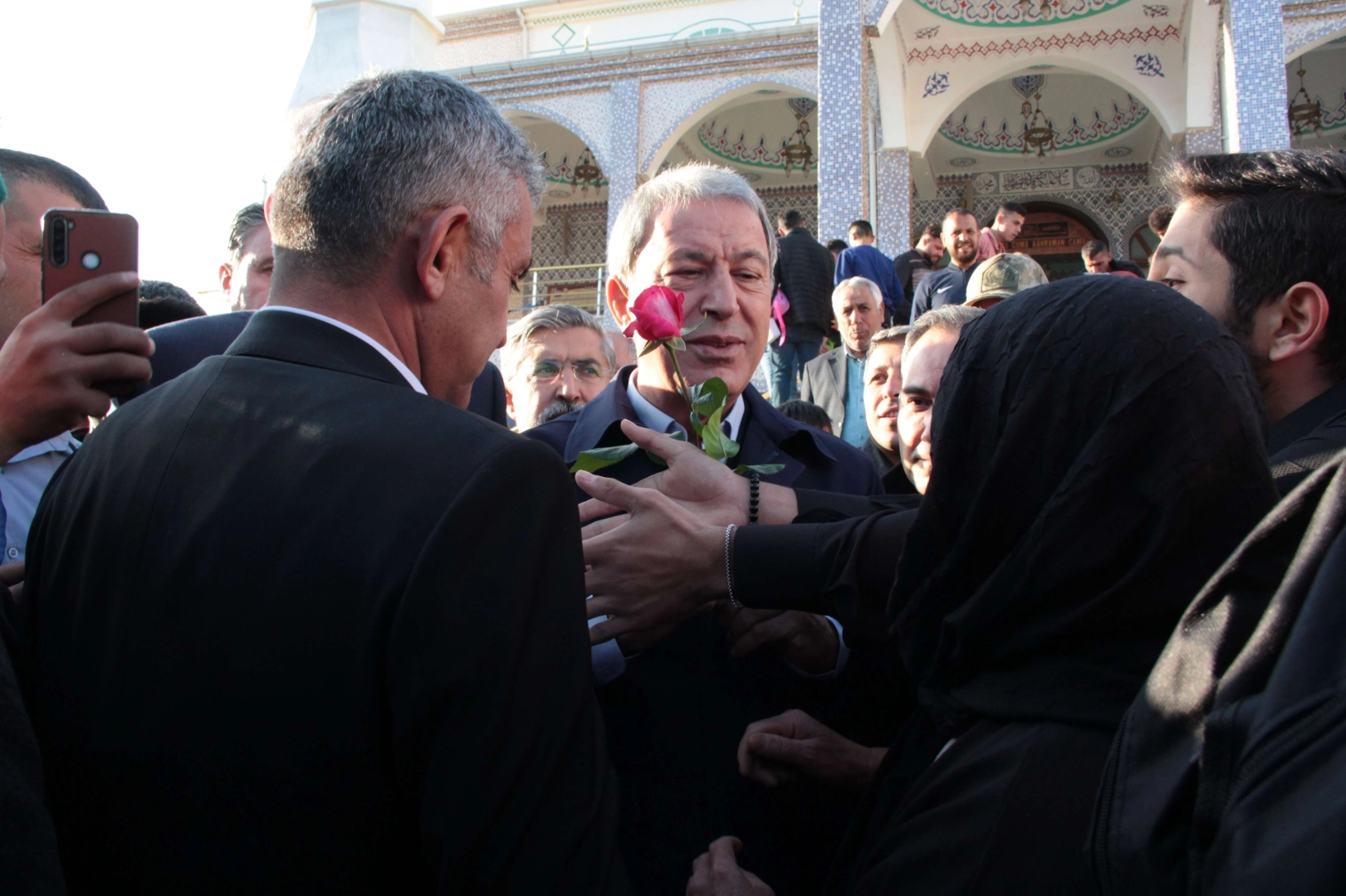 Konuşmaların ardından depremzede Akar ve Kurtulmuş ile bol bol fotoğraf çektirerek, bayramlaştı. Bir depremzede kadın ise Hulusi Akar'a gül verdi.