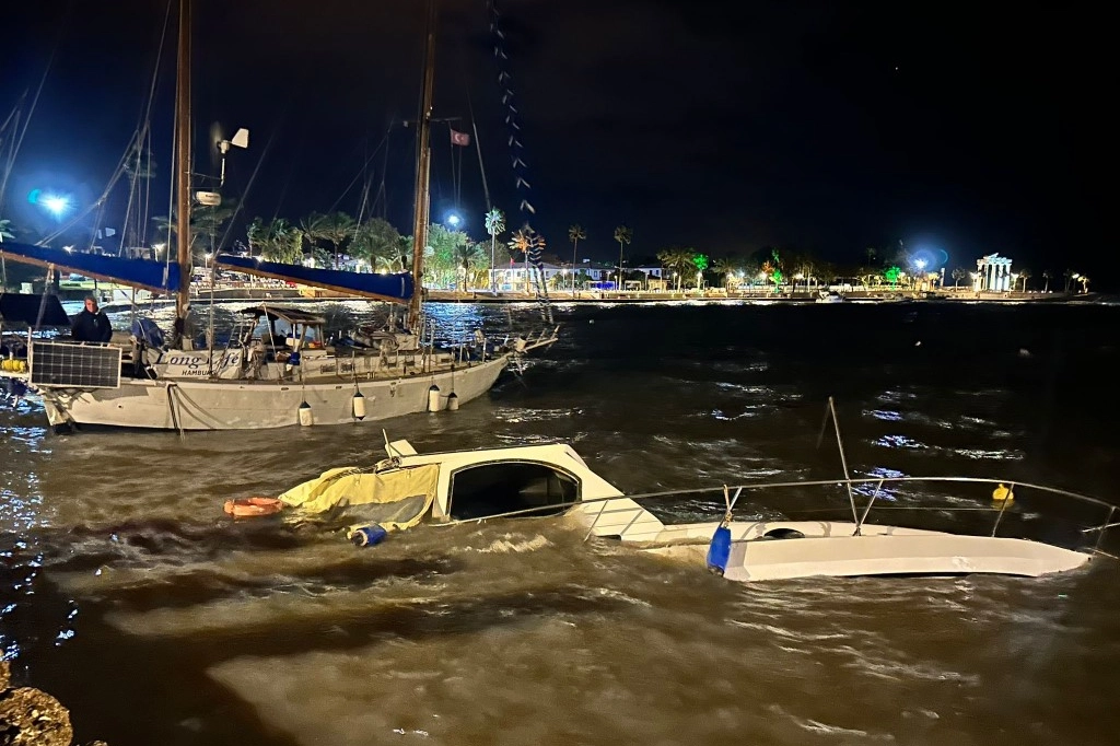 Akşam saatlerinde D 400 karayolunda ağaçların devrilmesine sebep olan fırtına gece saatlerinde Side Mahallesinde limanda etkili oldu. Limanda bağlı halde bulunan bir balıkçı teknesi ile fiber bot yürüyüş yolunun geçen dalalar sebebiyle battı.