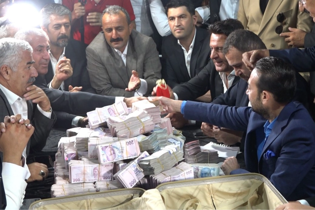 Toplanılan paralar bavullara konularak taşınırken, takı töreninin ardından yüzlerce kişi halay çekti. Düğün törenine sosyal medya ve televizyonlarda sürekli boy gösteren Tıvorlu İsmail de katılım sağladı.