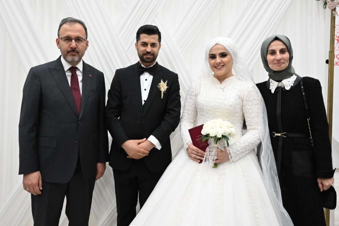 Kahramanmaraş merkezli depremden etkilenen vatandaşların bir kısmı ülke genelinde Gençlik ve Spor Bakanlığı'na bağlı öğrenci yurtlarında misafir ediliyor. Malatya’dan gelerek Çubuk Kız Öğrenci Yurdu'na yerleşen İlknur ve Suat Akgün çifti, kaldıkları yurdun konferans salonunda düzenlenen nikah töreni ile dünyaevine girdi. Çiftin bu mutlu gününde nikah şahitliğini ise Gençlik ve Spor Bakanı Mehmet Muharrem Kasapoğlu yaptı. “Her bir yeni güne umutla yaklaşacağız” Kıyılan nikahın ardından çifte aile cüzdanını vererek tebrik eden Bakan Kasapoğlu, “Çiftimize bir ömür boyu ve tabii ki sonrasında da dünya ve ahiret saadeti temenni ediyorum. Allah hayırlı uğurlu eylesin. Tabii çok zor süreçler yaşadık. Hamdolsun yaralarımızı yine kenetlenerek, omuz omuza ve el ele vererek sarıyoruz, saracağız. Elbette hayat devam ediyor. Geçtiğimiz günlerde Diyarbakır’da Selahattin Eyyubi Yurdumuzdaydım. Orada bir gün önce doğmuş bir bebeğimizle tanıştık. Bir yanda yeni doğan çocuklar, okula başlayan çocuklar ve diğer yanda iki arkadaşımızın mutluluğuna ortak olduk. Her bir yeni ana, her bir yeni güne umutla yaklaşacağız. Biliyorsunuz bu yurtlar bu ülkenin öğrencilerinin mekanı. Ama aynı zamanda zor anlarda bu ülkenin tüm evlatlarının yuvası oldu. Bugün de böylesine özel bir ana ev sahipliği yaptı. İnanıyorum ki tüm güzellikler ve mutluluklar onlarla olsun. Gençler bu ülkenin yarınları olarak daha aydınlık yarınlara yürüsünler” ifadelerini kullandı. “Her şartta mutluluğa ulaşabilirsiniz” Gelin İlknur Akgün, “Şeref duyduk. Herkesin emeği çoktu üzerimizde. Herkese çok teşekkür ederiz” derken, damat Suat Akgün ise, “Bakanımıza programa katıldığı için çok teşekkür ederiz. Güzel günümüze şahitlik ettiler ve bu ana bizi hazırladılar. Herkese teşekkür ediyoruz. İnşallah diğer gençlere umut oluruz. Hayallerinizin peşinde koşmaya devam edin. Her şartta mutluluğa ulaşabilirsiniz” şeklinde konuştu. Bakan Kasapoğlu, nikahın ardından çift ile hatıra fotoğrafı çektirdi.