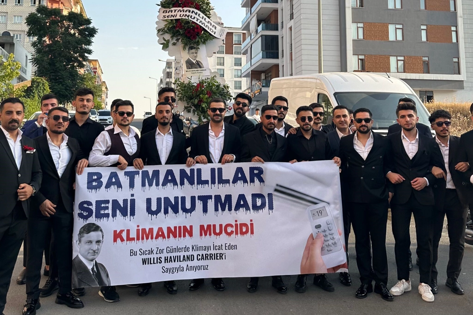 Hava sıcaklığının 45 dereceyi aştığı Batman’da bir grup genç, siyah takım elbiseler giyip güneş gözlükleri takarak klimanın kaşifi Amerikalı mühendis Willis Haviland Carrier için anma etkinliği düzenledi.