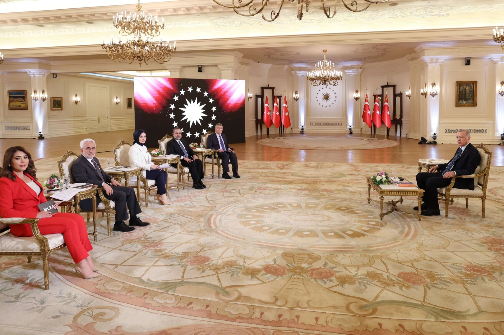 Cumhurbaşkanı Erdoğan, Cumhurbaşkanlığı Külliyesi'nde Kanal 7 ve Ülke TV'nin ortak yayınına katıldı. Yaklaşık 1,5 saat gecikmeli olarak saat 23.30’da başlayan programda Cumhurbaşkanı Erdoğan, açıklamalarda bulunurken yayın kesildi. "İZLEYİCİLERDEN HELALLİK DİLİYORUM" Program yaklaşık 20 dakikalık aranın ardından kaldığı yerden devam ederken Erdoğan, bir rahatsızlık geçirdiğini belirtti. Yaşadığı rahatsızlıkla ilgili açıklama yapan Erdoğan "Yoğun kampanya çalışmaları vardı. Bu kampanya çalışmaları sebebiyle de midemi ciddi manada üşütmüşüm. Bir ara programı iptal etsek diye ciddi manada düşündüm. Dedim ki artık 'söz verdik gideceğiz.' Tabii bu yoğun mesai içinde bizde zaman zaman böylesi durumlarla karşılaşıyoruz. Sizlerden ve seyircilerimizden helallik diliyorum." dedi. Cumhurbaşkanı Erdoğan'ın açıklamasının ardından program sonlandırıldı.