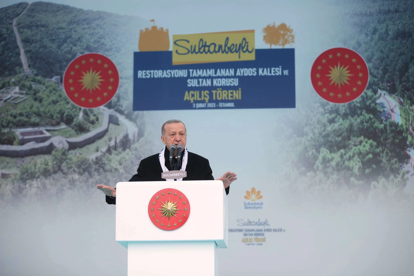 Cumhurbaşkanı Erdoğan, Sultanbeyli’de restorasyonu tamamlanan Aydos Kalesi ile Sultan Korusu’nun açılış töreninde yaptığı konuşmada, “Ülkemizin 14 Mayıs'ta gideceği seçimlerde küresel güçleri arkasına alarak yeniden tek parti faşizmini hortlatmak isteyen zihniyete karşı yeni bir meydan okumaya hazırlanıyoruz” dedi.