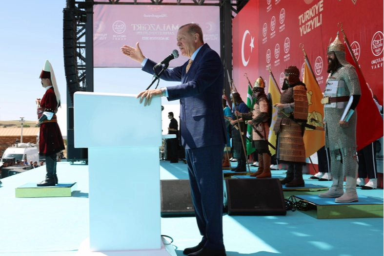 Cumhurbaşkanı Erdoğan, Malazgirt Zaferi’nin 952. Yılı etkinlikleri çerçevesinde Muş’un Malazgirt ilçesinde düzenlenen kutlama etkinliklerine katıldı. Burada toplanan kalabalığa hitap eden Erdoğan, “Bugün Malazgirt Zaferi’nin 952. yıl dönümü dolayısıyla şu mübarek topraklarda tekrar bir aradayız. Anadolu’yu bizlere vatan haline getiren tüm şehitlerimizi, gazilerimizi, gönül sultanlarımız rahmetle anıyorum. Sultan Alpaslan’ın ve ordusundaki her bir neferin bizlere emaneti olan bu toprakları kanımızın son damlasına kadar korumu azim ve kararlılığını buradan bir kez daha ilah ediyorum. Şu hakikat asla unutulmamalıdır ki Malazgirt öyle sıradan bir savaş, sıradan bir zafer değildir. Biz Anadolu’ya Malazgirt ile ayak basmadık. Çok daha öncesinden beri zaten buradaydık. Malazgirt Anadolu’daki siyasi hükümdarlığımızın kapılarını açmıştır. Burada kazanılan zafer önce Anadolu Selçuklu Devleti'nin kuruluşunu sağlayarak Haçlı akınlarına en büyük darbeyi vurmuştur. Ardından aynı inançla bayrağını yükselten Osmanlı'nın başarılı mücadeleleriyle Balkanların ve İstanbul'un fethine vesile olmuştur. Bir başka ifadeyle Malazgirt; İznik’in, Konya'nın da, Bursa'nın da, Edirne'nin de, İstanbul'un da büyük kardeşidir. Bizi, Viyana önlerine götüren zaferler zincirinin çıkış noktası işte burasıdır. Malazgirtli vatandaşlarım böyle bir mirasa sahip oldukları için ne kadar şükretseler, ne kadar gururlansalar azdır. Her ilimizin, her ilçemizin bizim kalbimizdeki yeri elbette ayrıdır. Ama Malazgirt sahip olduğu bu manevi mirasla kalbimizde hepsinden ayrı bir konuma sahiptir” dedi.