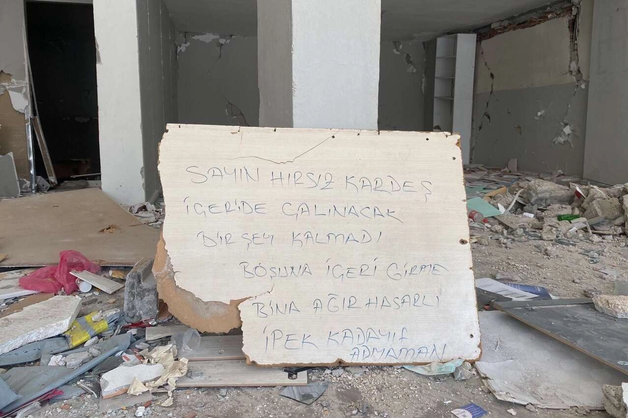 Boşuna içeri girme, bina ağır hasarlı” yazılı bir uyarıda bulundu. Yaldız, hırsızlara yaptığı uyarı yazılarını da bina içerisine ve önüne koydu. Ağır hasarlı binanın alt kısmında bulunan iş yerinden belirli aralıklarla iş yeri malzemelerinin çalındığını belirten Faruk Yaldız, “Bizler depremde insanları canlı kurtarmanın peşine düşmüşken hırsızlar ise kendi işinin peşine düştü. İş yerimizde ne var ne yok hepsini çaldılar. Her geldiğimde bir şeyler çalınmıştı. Bu olaylara karşı dayanamadım, iş yeri içerisine ve dışına levhalar astım. “Sayın hırsız kardeşim içeride çalınacak bir şey kalmadı, içeriye boşuna girmenin anlamı yok. Bina ağır hasarlı seni düşünüyorum diye bir levha astım. Bu şekilde hırsızları uyarmak istedim. İş yerinde terazi, doğalgaz saati, elektrik kablo tesisatımız komple çalındı, büro ofis mobilyalarımızın hepsi çalındı. Kameralarımız çalındı, masa sandalyemiz çalındı, buzdolabı ve ocağımız çalındı. Bize yarayacak bir şey kalmadı” diye konuştu.