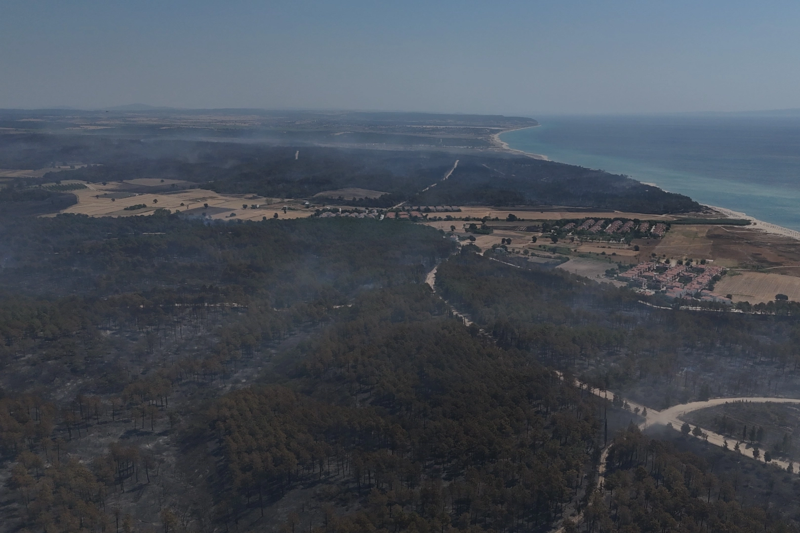 Edirne'nin Enez ilçesine bağlı Büyükevren köyünde çıkan ve rüzgarın etkisiyle yakın köylere de sıçrayan orman yangını, havadan ve karadan süren çalışmalar neticesinde 16 saat sonra kontrol altına alındı. 7 evin yandığı, 15 kişinin yaralandığı ve 2 bin 700 kişinin tahliye edildiği yangın yaşandığı ormanlık alan, havadan görüntülendi.