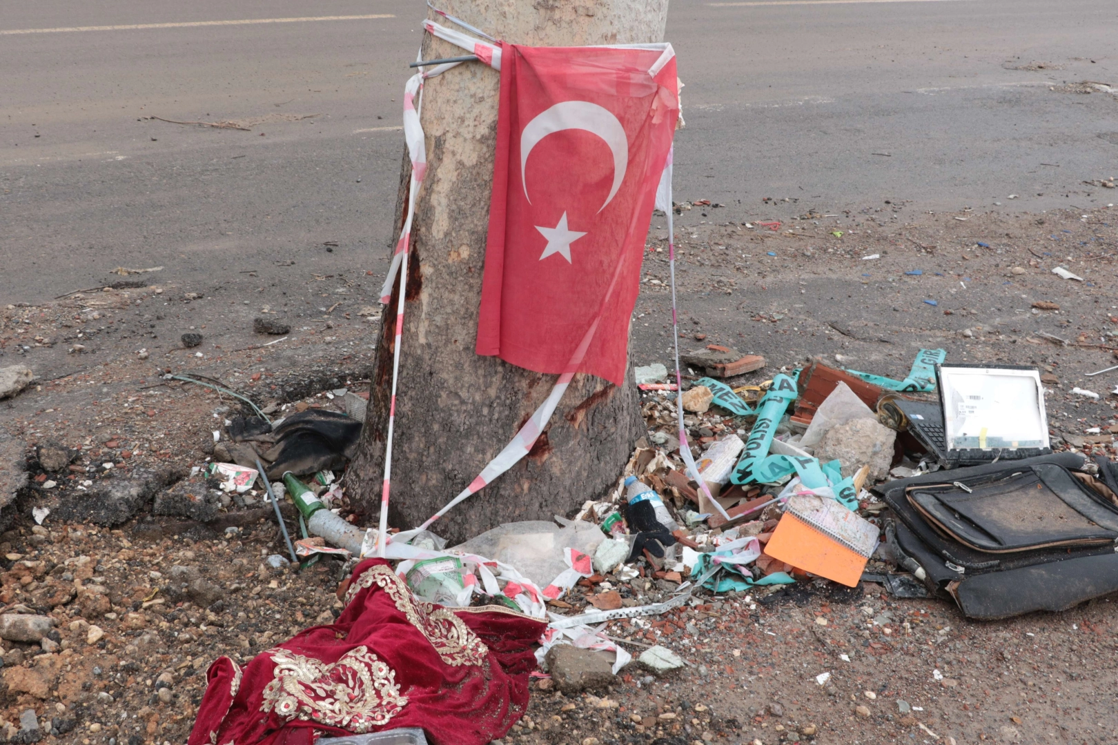 Vatandaşlardan Ferhat Korkulu, “Bizler esnaf olarak kepenk açtık ancak enkazlardan çıkan Kur’an ve Türk bayrakları ağaçlara bırakılmış, yerde kalmamış. Biz elimizden geldiğince yerden alıp yüksek yerlere bırakıyoruz. Biz de böyle görünce hoşumuza gidiyor” dedi.