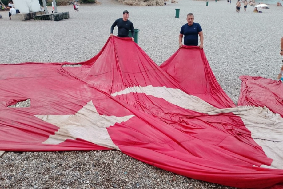 Antalya’da Konyaaltı sahilinde dalış yapan dalgıçlar su altında tesadüfen karşılaştıkları manzara karşısında hayrete düştü. Dalış sırasında gruptan bir kişinin dikkatini çeken cismi inceleyen dalgıçlar dev Türk bayrağı ile karşılaştı. Kıyıdan 250 metre mesafede ve 26 metre derinlikte bulunan yaklaşık 8 metreye 12 metre ebatlarında olan bayrağı bulunduğu yerden çıkartmak için çalışma başlatan dalgıçlar ilk olarak bayrak üzerinde ki deniz tabanı mili temizlendi. Bayrağın büyüklüğü nedeniyle su yüzeyine çıkarmak için dalgıçlar paraşüt adı verilen yardımcı ekipmandan faydalandı.