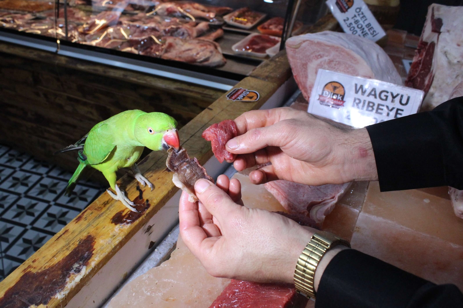 apon Kobe sığırından elde edilen Wagyu etinin kilosunu, İzmir’de 22 bin liradan satışa sunan kasap Mehmet Günbey, papağanı Ayaz’ı da bu etle besliyor. Ayaz’ın Wagyu etini çok sevdiğini belirten Günbey, “Normal eti yemiyor ama 22 bin liralık etin tadına doyamıyor. Bu eti kendimiz yemiyoruz ama papağanımıza yediriyoruz” dedi.