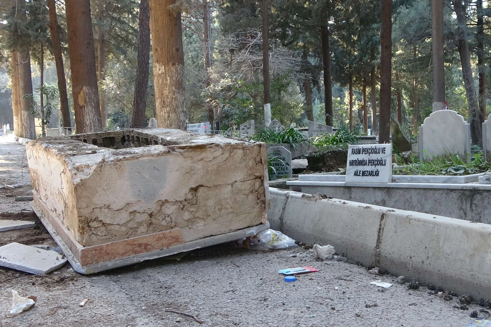 Kahramanmaraş’ta meydana gelen 2 depremin ardından Hatay’da yüzlerce bina yıkılırken binlerce binada ise hasar oluştu. Depremin yıkıcı etkisi sadece binalara olmazken Antakya Asri Mezarlığında bazı mezarlarda hasar oluşurken bazılarının da yola uçtuğu görüldü.
