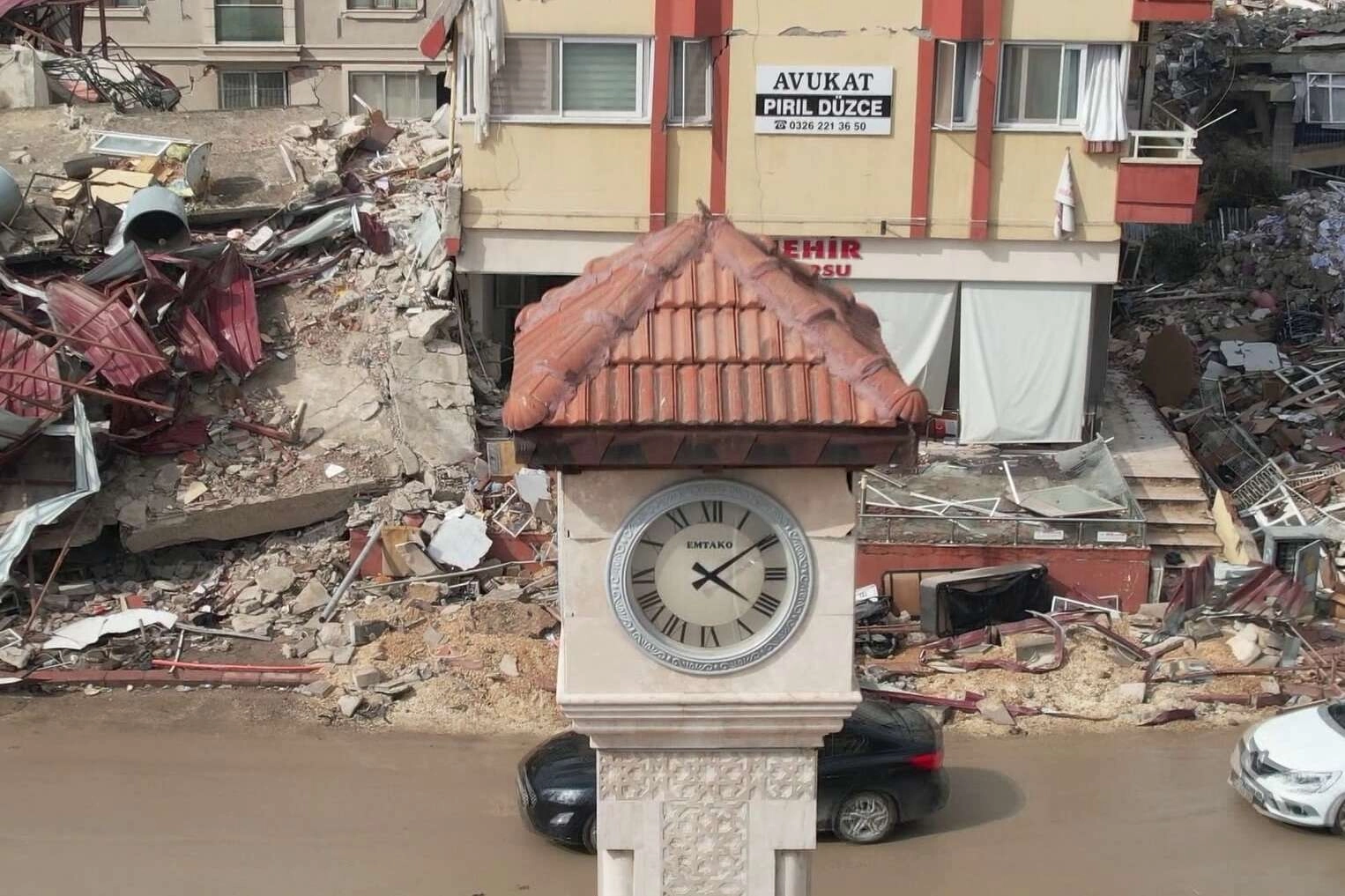 Kahramanmaraş merkezli meydana gelen depremlerde büyük yıkıma uğrayan Hatay’da saat kulesindeki saatler de depremde durdu. Duran saat dron ile görüntülendi.