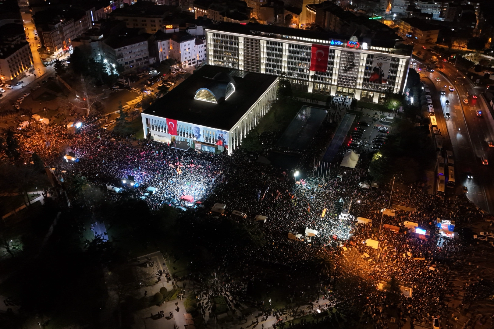 İBB binası önündeki kalabalık havadan görüntülendi. İstanbul Cumhuriyet Başsavcılığı tarafından yürütülen iki ayrı soruşturma kapsamında aralarında İBB Başkanı Ekrem İmamoğlu'nun da bulunduğu 87 şüpheli gözaltına alınmıştı. Gözaltına alınan şüpheliler sabah saatlerinde İstanbul Emniyet Müdürlüğü Vatan Yerleşkesi'ne götürülmüştü. İmamoğlu'nun gözaltına alınmasının ardından partililer Fatih Saraçhane'deki İBB binasının önünde toplandı. İBB Başkanı Ekrem İmamoğlu'nun eşi Dilek İmamoğlu ve İstanbul'a gelen CHP Genel Başkanı Özgür Özel, İBB binası önünde toplanan kalabalığa yönelik bir konuşma yaptı. Polis ekiplerinin çevrede geniş güvenlik önlemi aldığı görülürken, toplanan kabalık havadan dronla görüntülendi.