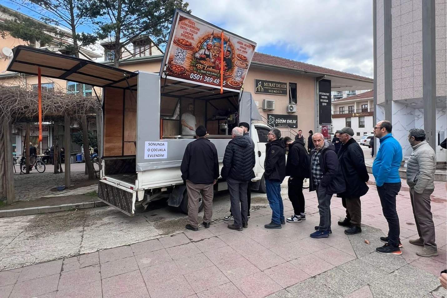 İnegöl Sani Konukoğlu Camii önünde kurulan lokma aracında vatandaşlara ikramda bulunulurken, lokma aracına asılan "Sonunda o çocukla evlendim" yazısı dikkat çekti. Lokma dağıtımı çevredeki vatandaşlar tarafından ilgiyle karşılandı.