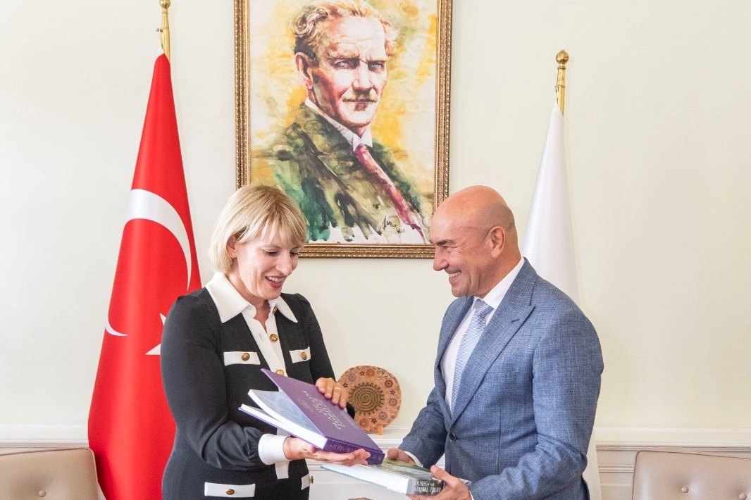 İzmir Büyükşehir Belediye Başkanı Tunç Soyer, İngiltere’nin Ankara Büyükelçisi Jill Morris ve beraberindeki heyeti makamında ağırladı. Ziyaretten duyduğu memnuniyeti dile getiren İzmir Büyükşehir Belediye Başkanı Soyer, karşılıklı ilişkilerin daha da geliştirilmesi için adımlar atılması gerektiğini belirtti. İzmir’in tarih, kültür, turizm açısından taşıdığı zenginlik, miras ve potansiyeli hakkında misafirlere bilgi veren Büyükşehir Belediye Başkanı Soyer, “İzmir esenlik, refah ve iyilik kentidir. Doğamızla gurur duyuyoruz” dedi. İZMİR’E ÖVGÜ İzmir’den övgüyle söz eden Büyükelçi Morris, her yıl 4 milyon İngiltere vatandaşının Türkiye’ye turist olarak geldiğini belirtti. Morris ayrıca geçen yıl başlayan İzmir-Midilli seferlerini duyduğunu aktararak, “Tebrik ederim, çok güzel bir proje” dedi. Başkan Soyer de, “Geçen seneye kıyasla yolculuk oranı üç kat arttı” diye konuştu. ORTAK PROJELER Büyükelçi ve Başkan Soyer, iklim krizi, doğal afetlere karşı dirençlilik, rüzgar enerjisi, eko-turizm, ticaret başlıkları altında ortak projeler yürütmek için fikir alışverişinde bulundu. Başkan Soyer eko-turizm alanında yaptıkları çalışmaları anlattı. Morris de, eko-turizmin artık çok popüler olduğunu, doğa temelli tatil pazarının büyüdüğünü belirterek, İzmir’de yürütülen çalışmaların önemli olduğunu ifade etti. Başkan Soyer enerji konusunda ise “Bizim enerji üreten bir belediye firmamız var. Belediye ile doğrudan beraber çalışabiliriz” dedi.