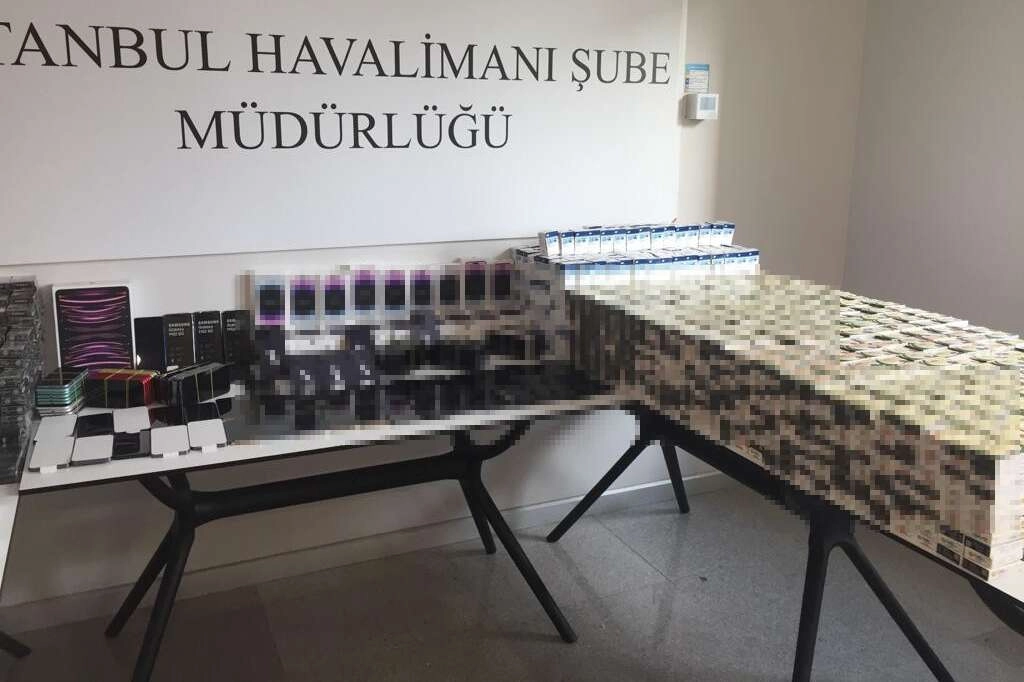 İstanbul Havalimanı Emniyet Şube Müdürlüğü ekiplerinin havalimanında, yeni yılın ilk iki haftasında yapılan operasyonlarda ele geçirilen çok sayıda cep telefonu, ilaç, cinsel güç artırıcı hap, safran bitkisi ile tütün ürünlerini sergiledi. Polis ekiplerinin dış hatlar geliş terminali katında gümrüklü alan çıkışında ve yurt dışına gidecek yolculara yönelik yaptıkları uygulamalarda 3 kişide piyasa değeri yaklaşık 6 milyon TL olan popüler markalara ait 160 adet cep telefonu ele geçirildi.