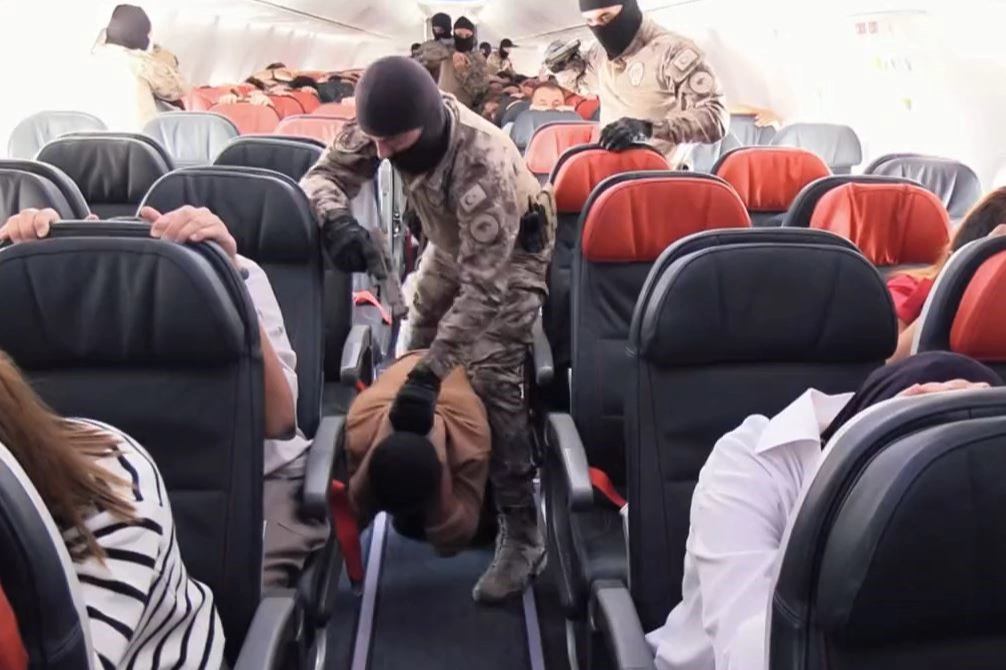 Özel Harekat Şube Müdürlüğü ekipleri, İstanbul Havalimanı’nda nefes kesen rehine kurtarma tatbikatı yaptı. Senaryo gereği uçak etrafından önlem alan ekipler, daha sonrada uçağın içine girerek rehineleri kurtardı.