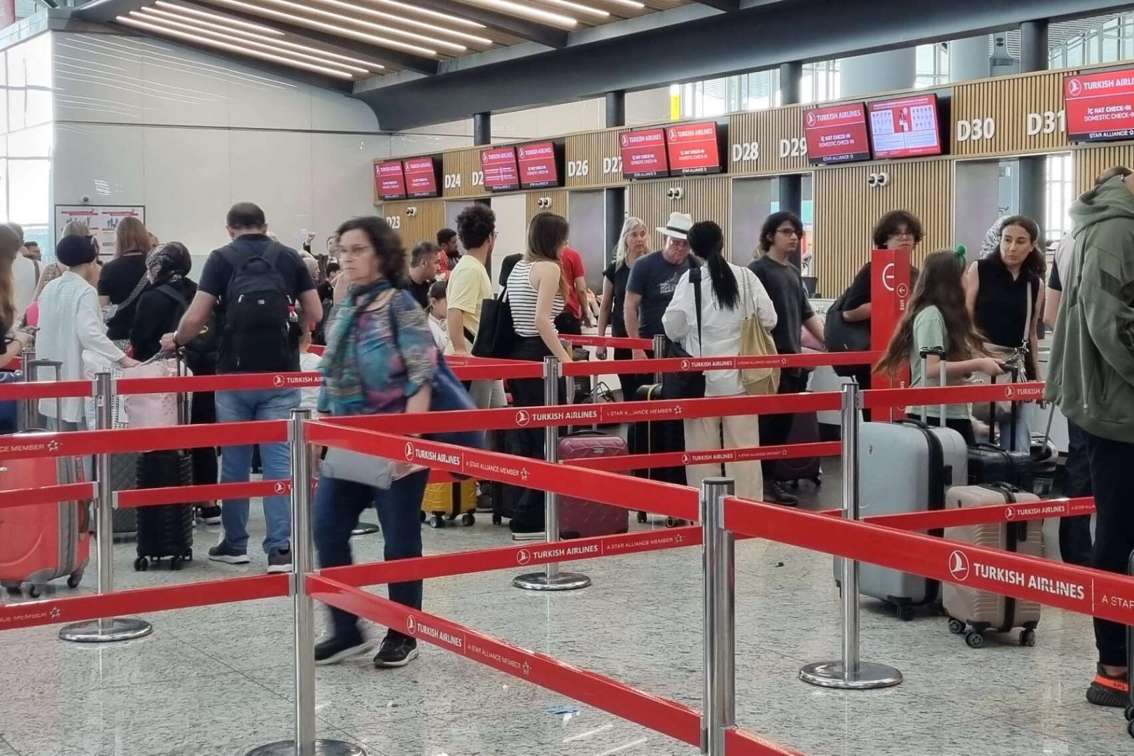 İlk, ortaöğretim ve lise kademelerindeki okullarda eğitim gören milyonlarca öğrenci ile birlikte bu kurumlarda görev yapan yaklaşık 1 milyon 201 bin 138 öğretmen için 2022-2023 eğitim öğretim yılı dün itibariyle tamamlandı. Okulların kapanmasıyla birlikte hem yaz hem de Kurban Bayramı tatilini değerlendirmek isteyen vatandaşlar sabahın erken saatlerinden itibaren İstanbul Havalimanına geldi. İstanbul Havalimanında yoğunluk oluşması nedeniyle İGA ekipleri havalimanı girişinde ve terminalde yolcuları yönlendirdi. Güvenlik kontrolünün ardından terminale gelen yolcular, bilet ve valiz işlemleri için iç ve dış hat kontuarlarında sıraya girdi. Hem iç hem de dış hatlar kontuarlarında uzun kuyruklar oluştu.