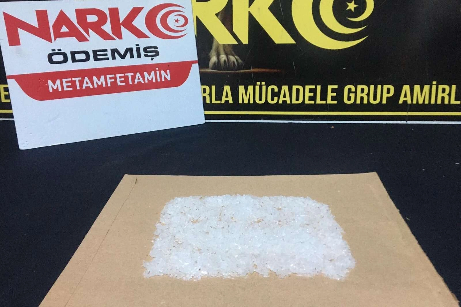 Ödemiş Narkotik Grup Amirliği ekipleri, uyuşturucu madde imal ve ticaretini önlemeye yönelik yaptığı çalışmalar çerçevesinde, bir adreste uyuşturucu bulunduğu bilgisi üzerine çalışma başlattı. Ödemiş Cumhuriyet Başsavcılığı koordinesinde harekete geçen ekiplerin adreste yaptığı aramada, 68 gram metamfetamin maddesi ele geçirildi.