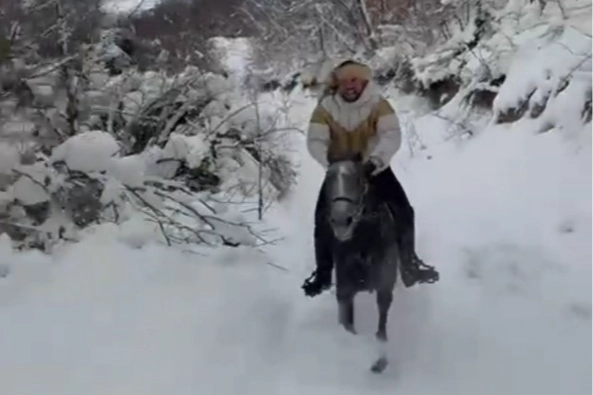 Düzce’de yaptığı paylaşımlarla sosyal medyada çok sayıda kişinin beğenisini toplayan Muaythai antrenörü Muhammed Bişgin, bu kez karla kaplı alanda at üzerinde dört nala ilerleyerek adeta şov yaptı. Düzce’de etkili olan kar yağışı, hem doğayı beyaza bürüdü hem de maceraseverlere eşsiz fırsatlar sundu.