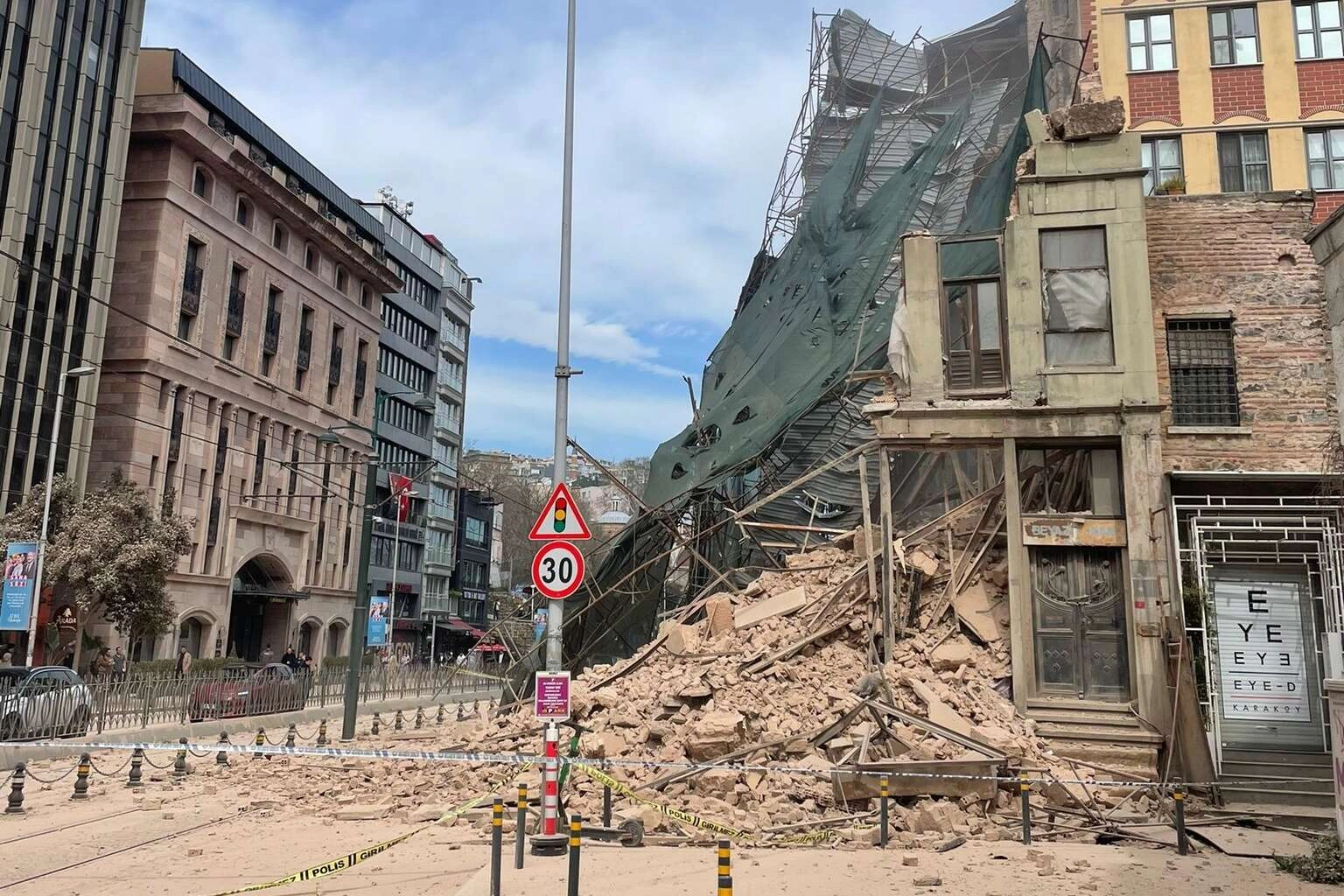 Beyoğlu Karaköy, Kemeraltı Caddesi üzerinde bulunan tadilat yapılan 5 katlı metruk bina sabah saatlerinde kısmen çökmüş, beton parçaları yola dökülmüştü.