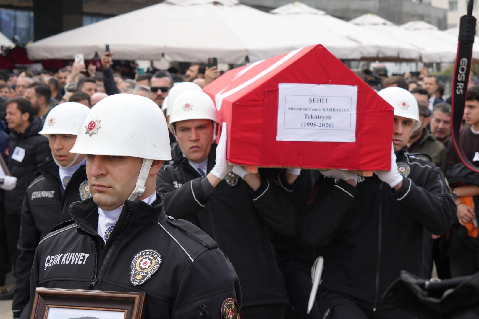 Kılınan cenaze namazının ardından Süleyman Cemre Kahraman ve İsmail Enes Can’ın naaşları, tören mangası tarafından omuzlarda taşınarak cenaze araçlarına konuldu.