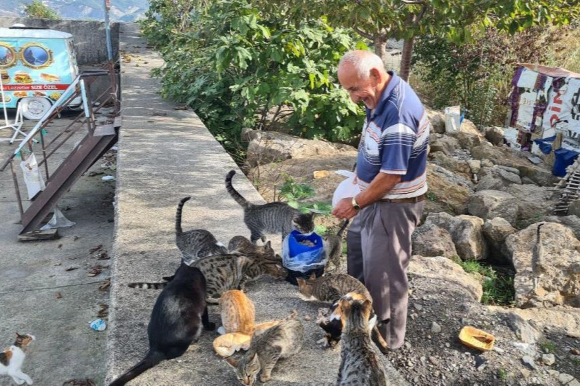 Zonguldak'ın Alaplı ilçesinde yaşayan 72 yaşındaki Hasan Kırmacıoğlu, her gün yürüyerek beş kilometre uzaktaki balıkçı barınağına giderek 100 kediyi kendi imkanları ile besliyor.