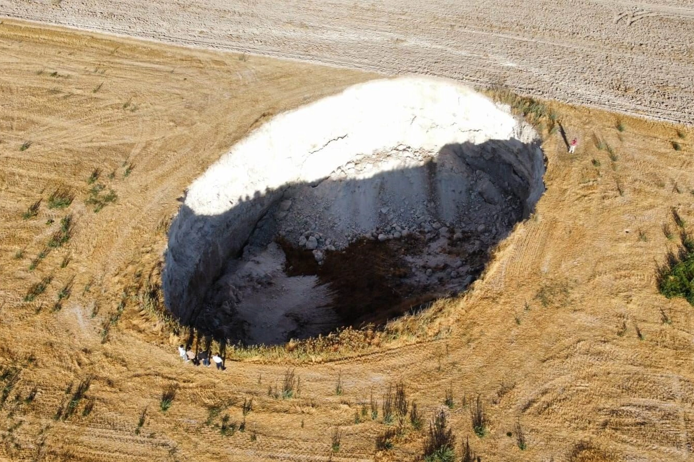Obruğun yaklaşık 100 metre ilerisinde ise tarlanın sahibi olan çiftçi Fatih Şık’ın evi bulunuyor. Fatih Şık’ın obruğun oluştuğu alanda geçtiğimiz yıl çatlakları fark ettiği, o alanda ekim yapmadığı öğrenildi. Obruğun yaklaşık 50 metre çapında 35-40 metre derinliğinde olduğu kaydedildi. Çevrede ise yaklaşık 1 ay önce buğday hasadı gerçekleştirildiği belirtildi.