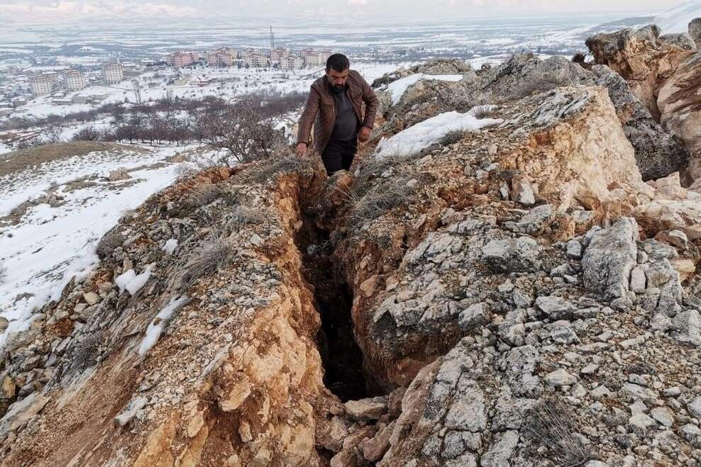 Kahramanmaraş merkezli depremlerin vurduğu Malatya’nın Akçadağ ilçesinde bir dağda derin yarıklar oluştuğu görüldü.