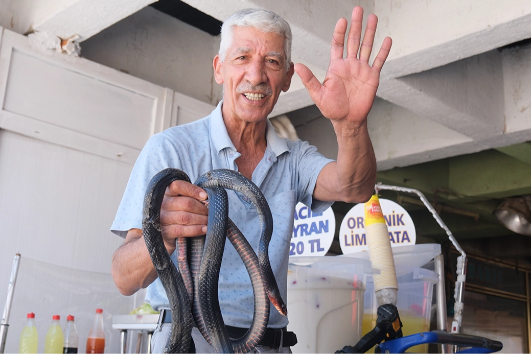Adana Otogarı’nda uzun yıllardır çiğköfte satarak geçimini sağlayan Osman Aslan’ın (62) yılan sevgisi görenleri hayrete düşürüyor. Halk arasında ’zehirsiz kara yılan’ olarak bilinen yılanları besleyen ve defalarca yılanlar tarafından ısırılan Aslan, halen yılanları bir an olsun bırakmıyor ve onları elleriyle süt içirerek besliyor. Ayrıca Osman Aslan, Adana Otogarı’nda yılanlarla şov yapıyor.