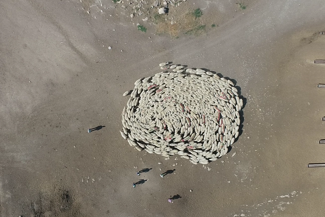Sürü yaklaşık 5 dakika boyunca peş peşe saat yönünde dönerek daire çizdi. 400'den fazla koyunun 30 koçla ilk buluştuğu anlar havadan görüntülendi.