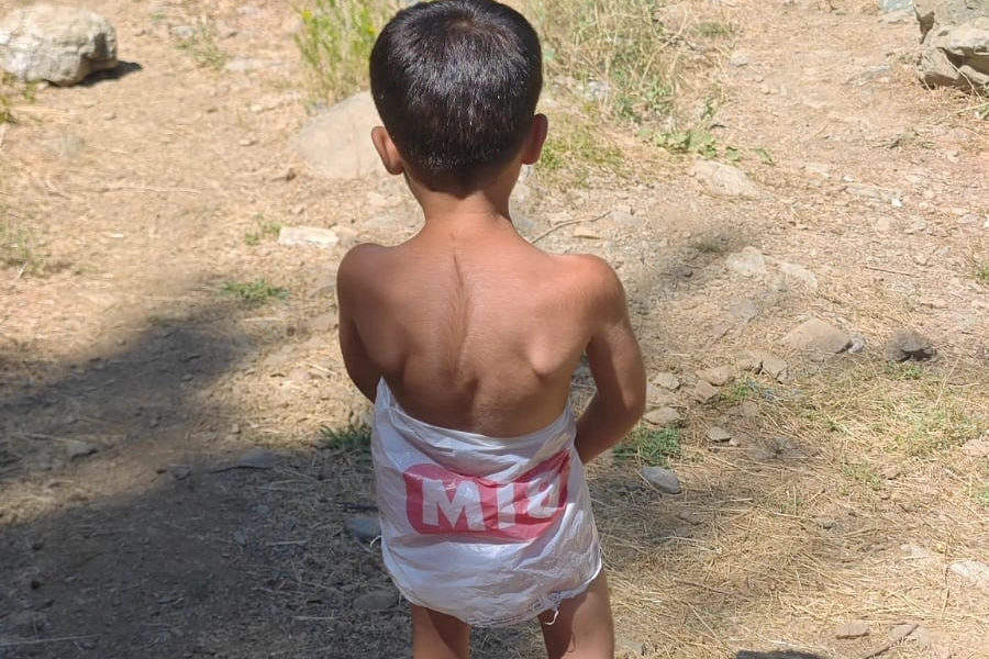 Elazığ'ın Palu ilçesinde sıcak havalardan bunalan bir çocuk, mayosu olmadığı için market poşetinden mayo yapıp suda serinledi.