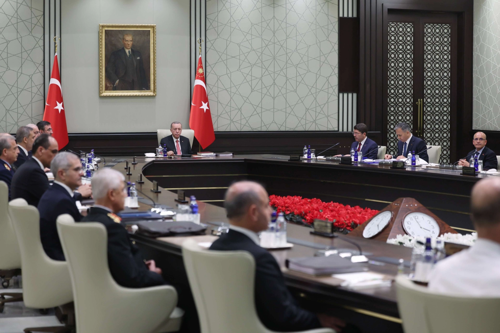Milli Güvenlik Kurulu (MGK), Cumhurbaşkanı Recep Tayyip Erdoğan'ın başkanlığında yeni üyeleriyle ilk kez toplandı. Cumhurbaşkanlığı Külliyesi’nde yaklaşık 3 saat süren toplantı sonrası yayımlanan bildiride, “Türkiye Cumhuriyeti'nin geride bıraktığımız yüzyılda karşı karşıya kaldığı sınamaların, milletimizin demokrasiye olan inancı ile istiklal ve istikbal mücadelesindeki azmini keskinleştirirken devletimizin temellerini daha da sağlamlaştırdığı belirtilmiş; Türkiye yüzyılının başlangıcı olan yeni dönemde de ülkemizin güvenliğini, huzurunu ve refahını sağlamaya yönelik adımların aynı kararlılıkla atılmasına devam edileceği vurgulanmıştır” denildi. PKK/KCK-PYD/YPG, FETÖ ve DEAŞ terör örgütleri başta olmak üzere, millî birlik, beraberlik ile bekaya yönelik her türlü tehdit ve tehlikeye karşı yurt içinde ve yurt dışında azim, kararlılık ve başarıyla icra edilen operasyonlar hakkında kurula bilgi sunulduğu belirtilen bildiride, Suriye'nin toprak bütünlüğünün muhafazası ile kalıcı barış ve istikrarın tesisinin terör örgütlerinden temizlenmesi ile mümkün olacağı belirtildi. Çatışmalardan kaçan Suriyelilerin gönüllü, güvenli ve onurlu bir şekilde yurtlarına dönerek hayatlarını huzur ve refah içinde idame ettirebilmesi için gösterilen gayretlere katkı sağlayacak uluslararası iş birliğinin önemine dikkat çekildiği belirtilen bildiride, ”Kosova'da artan gerilimin, bölgedeki hassas dengeleri bozabilecek bir krize dönüşmesine fırsat verilmemesi maksadıyla diyalog ve istişare süreçleri devam ederken ülkemiz tarafından bölgeye verilen desteğin önemi vurgulanmıştır” denildi. Bildiride, Rusya ile Ukrayna arasında süren savaşın bölgeye yönelik riskleri artıran etkileri üzerinde durulduğu Türkiye'nin, çatışmalara son verilerek barış görüşmelerine başlanması ve küresel gıda güvenliğinin sağlanması çabalarına katkı sunmaya devam edeceği belirtildi. Azerbaycan ile Ermenistan arasındaki diyalog sürecinde kaydedilen ilerlemeden memnuniyet duyulduğu ifade edilen bildiride; "Hakkaniyete uygun bir çözümün hem Kafkasya'da kalıcı barışın tesisine esas teşkil edeceği hem de küresel istikrara önemli katkılar sağlayacağına işaret edilmiştir. Sudan'da çatışan taraflar, bir an evvel kalıcı ateşkes ilan ederek geçiş sürecinin kazanımlarını korumaya ve meseleleri uzlaşma yoluyla çözüme kavuşturmaya davet edilmiş; Türkiye'nin Sudan'da barış ve istikrarın sağlanmasına yönelik tüm çabalara bugüne kadar olduğu gibi bundan sonra da her türlü desteği vermeye hazır olduğunun altı çizilmiştir” ifadelerine yer verildi.