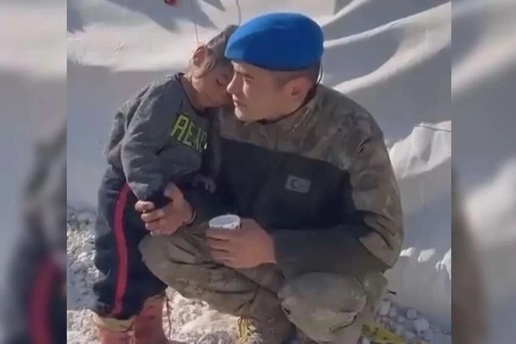 MSB tarafından paylaşılan bir görüntüde deprem bölgesindeki bir kız çocuğunun, yere çömelmiş askerin omzuna başını dayadığı anlar yer aldı.