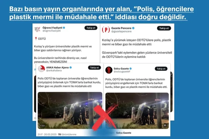 Dezenformasyonla Mücadele Merkezi tarafından yapılan açıklamada, "Basın yayın organlarında yer alan, “Polis, öğrencilere plastik mermi ile müdahale etti.” iddiası doğru değildir. İzinsiz yapılan gösteri sırasında göstericilere yönelik plastik mermi ile müdahale edilmesi söz konusu değildir. Emniyet Genel Müdürlüğü envanterinde plastik mermi bulunmamaktadır. Kamuoyunu manipüle etmeye yönelik asılsız iddialara itibar etmeyiniz" ifadeleri yer aldı.