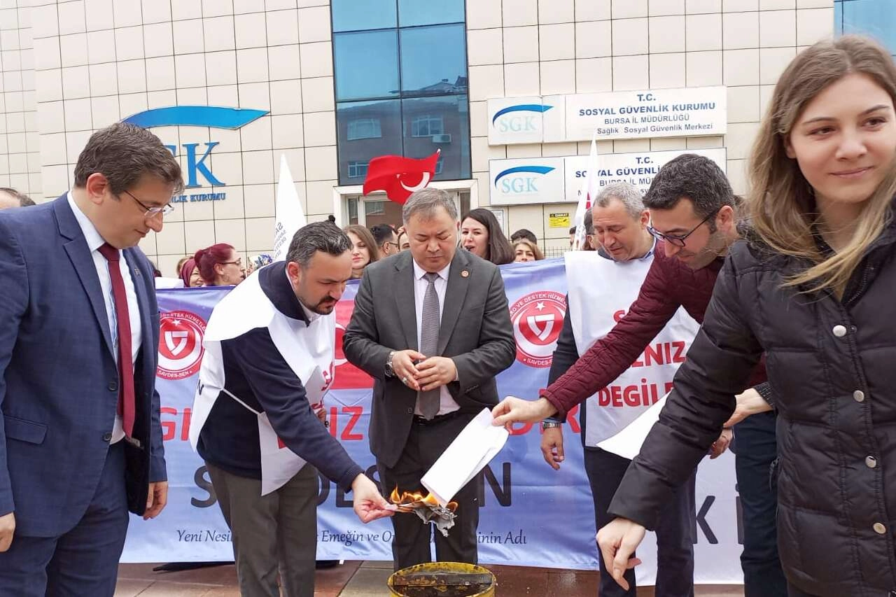 SAVDES-SEN Genel Başkanı Tuncay Cengiz Sosyal Güvenlik Kurumu Bursa İl Müdürlüğü önünde yaptığı açıklamayla SGK çalışanlarının mağduriyetinin giderilmesi gerektiğinin altını çizdi.