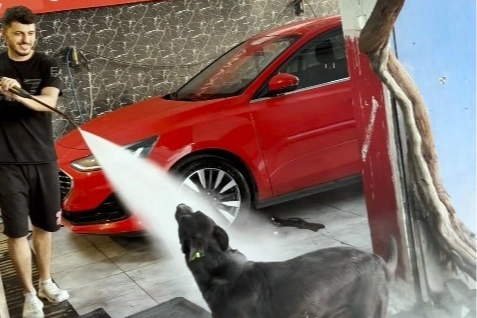 Çalışanların araçları yıkadıkları sırada köpeği de üzerine su tutarak serinlettiği anlar, izleyenleri tebessüm ettiriyor.