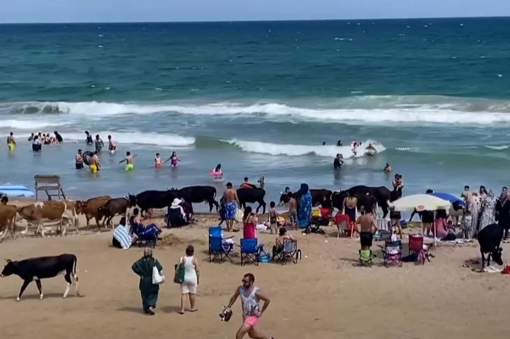 Çok sayıda vatandaşın toplu olarak denize girdikleri sahilde Cankurtaran ekiplerinin de şaşkın bakışları arasında vatandaşların arasına girerek sahilden uzaklaşan hayvanlar vatandaşlar arasında şaşkınlık yarattı.