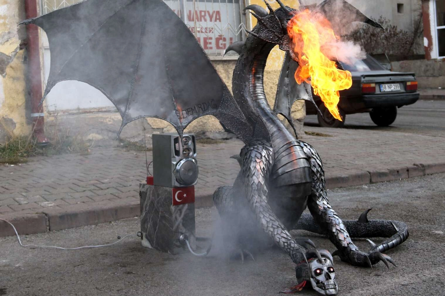 Sivas’ta yaşayan demir doğrama ustası İbrahim Doğan, hurda ve metal malzemeleri bir araya getirerek adeta bir sanat eserlerine dönüştürüyor. Küçük yaşlardan buyana demir işçiliğinde yeteneği olan Doğan, son olarak 160 santimetre boyunda ve yaklaşık 80 kilo ağırlığında hareket eden ve ağzından alev püskürten bir ejderha tasarladı.