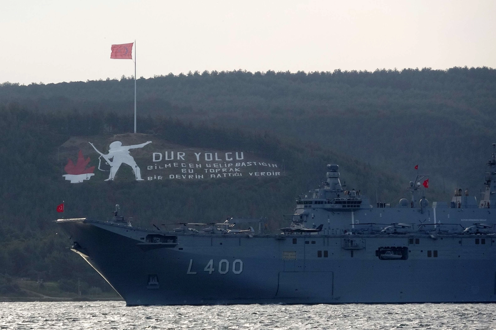 Kilitbahir köyü dağından bulunan ‘Dur Yolcu’ yazısı ile Kilitbahir Kalesi önünden geçen ‘TCG Anadolu’ gemisine kordonboyunda vatandaşlar ilgiliyle izledi. ‘TCG Anadolu’ kordonboyunda kendisini izleyen vatandaşları selamladı.