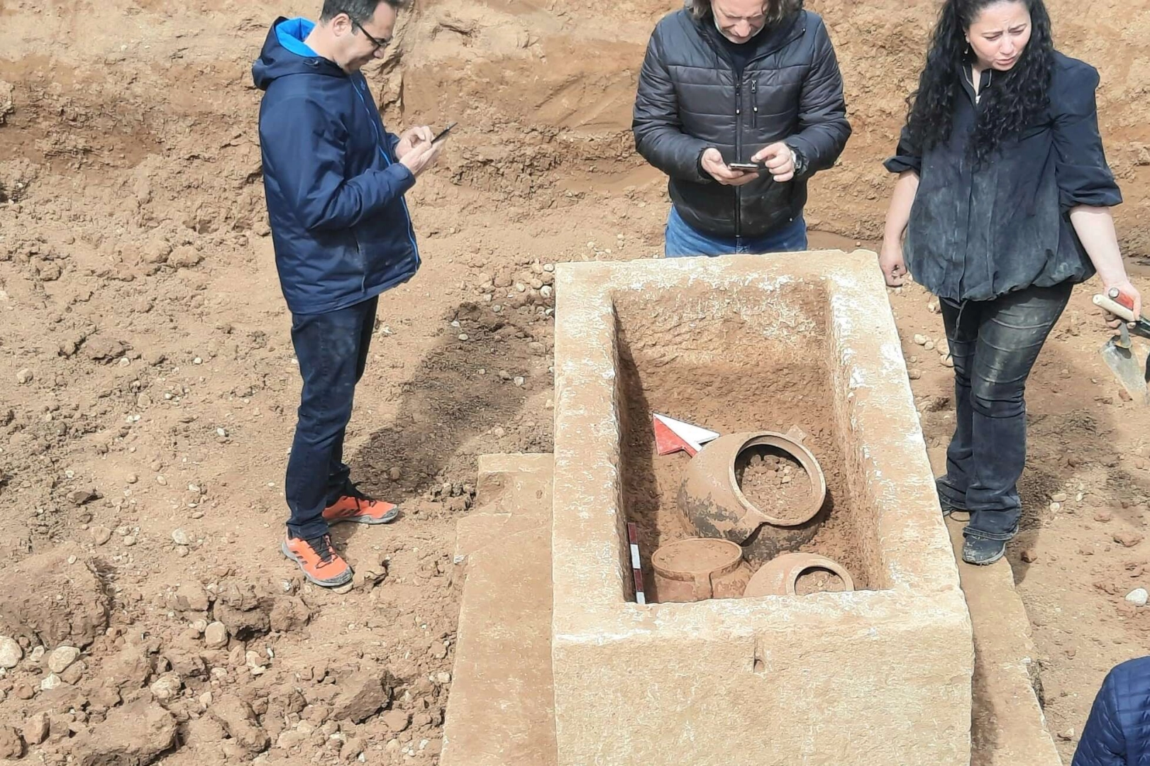 Bunun üzerine olay yerine arkeologlardan oluşa bir ekip sevk edildi. Lahitin bulunduğu alana gelen arkeologlar yaptıkları hassas kazı ile lahiti gün yüzüne çıkarmayı başardı. Bulunan lahitin daha sonra üst kapağı açıldı. Görevliler kapağı açılan lahidin içerisinde 3 toprak küp bulurken, küplerin içerisinden elde edilen objeler hakkında ise açıklama yapılmadı.