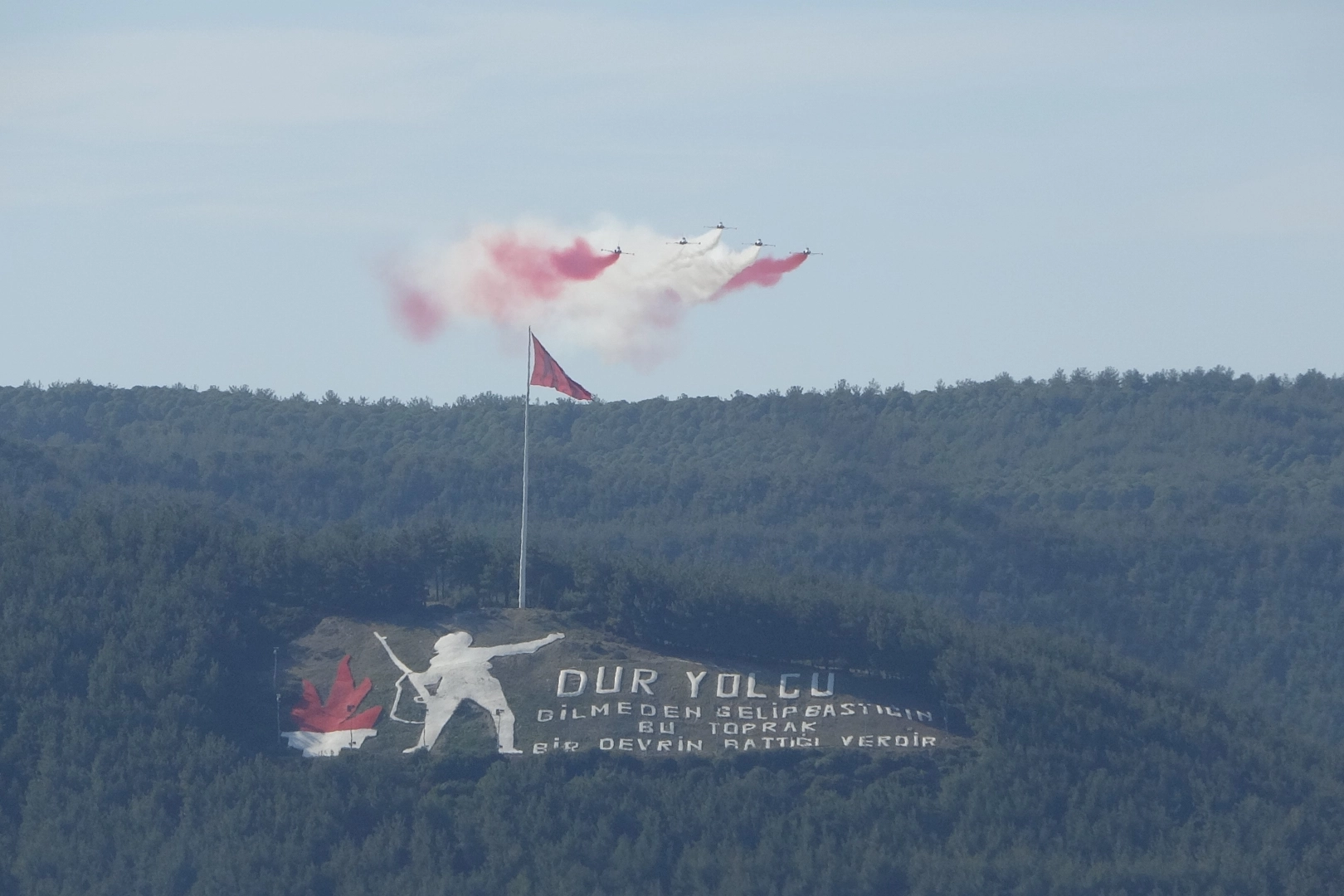 Şehitler Abidesindeki gösteri uçuşu öncesinde Bandırma 6'ncı Ana Jet Üssü'nden kalkış yapan Türk Yıldızları, Çanakkale semalarında gösteri uçuşu gerçekleştirdi. Türk Yıldızlarının gösteri uçuşu için binlerce Çanakkaleli kordonboyuna akın ederken, Türk Yıldızları, Çanakkale semalarında nefes kesen akrobatik hareketler sergiledi.