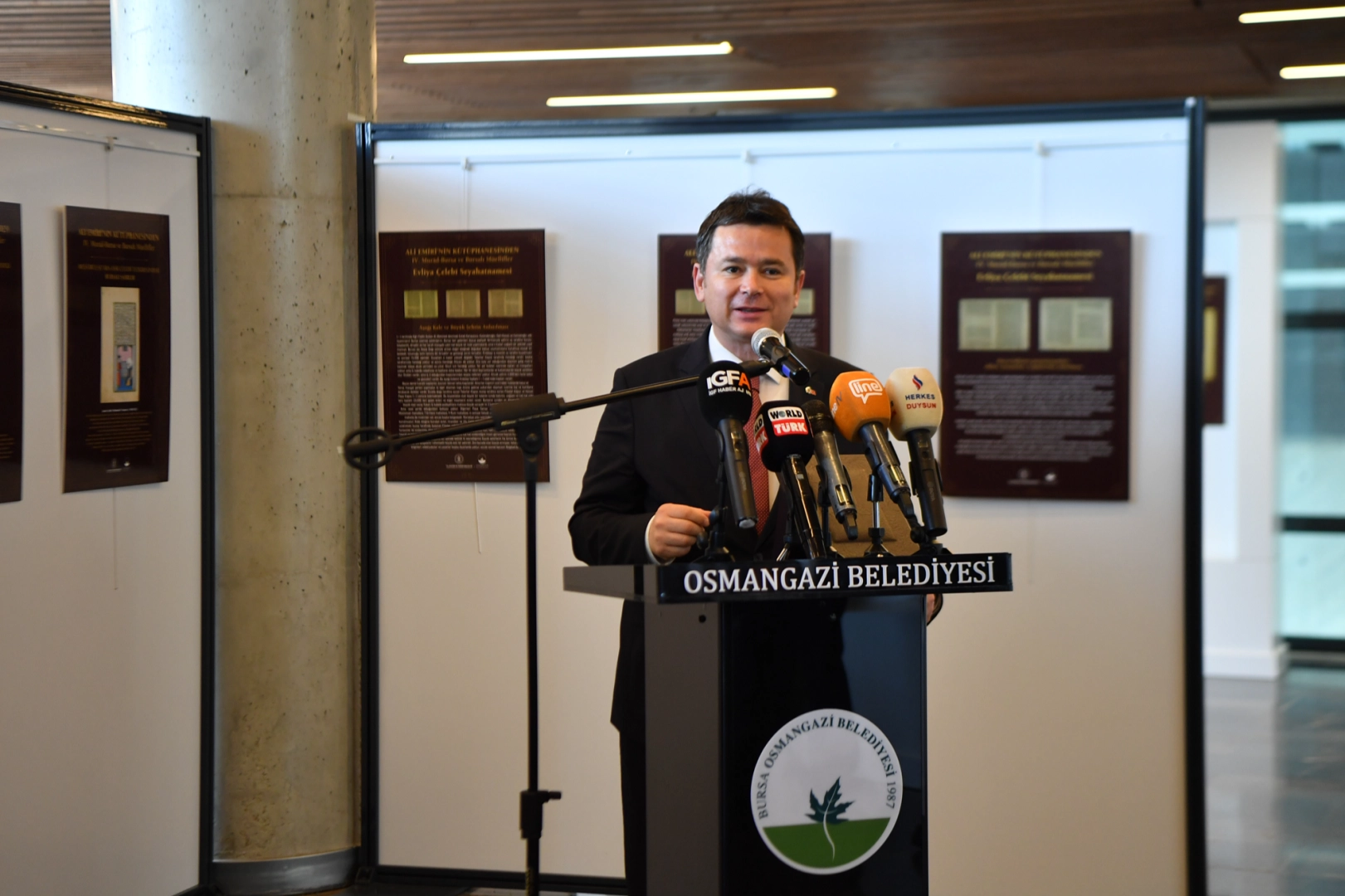 Ali Emiri’nin Kütüphanesi’nden 4. Murad Dönemi ve Bursalı Müellifler Sergisi’nin açılışında konuşan Osmangazi Belediye Başkanı Erkan Aydın, “23 yıl sabırla süren bir kuşatma ve hoşgörüyle fethedilen Bursa, bize sabırla yürünen yolun aydınlık sonucunu o gün gösterdi. Biz de Bursa’nın sabır, hoşgörü ve adalet şehri olduğunu 31 Mart’ta yeniden gördük. Tartışmasız ve umutla bize yetki veren Osmangazi’mizin her gününün fetih coşkusu ile geçmesi için bundan sonra el birliği ile var gücümüzle çalışacağız. Gençlerimizin, çocuklarımızın yeşeren umutlarını Bursa’nın çınarına dönüştürmek için çalışacağız. Bursa’nın fethi Osmanlı’nın batıya doğru da açılımı oldu. O günden bugüne Bursa geçmişten geleceğe bir köprü oldu. Yaşadığımız topraklar nice savaşlara sahne oldu. Tarihin en inanılmaz değişimleri bu topraklarda yaşandı. Dünyanın en zorlu halk direnişi, en güçlü kurtuluş mücadelesi ve en büyük devrimleri bu topraklarda gerçekleşti. Varlığıyla her zaman onur duyduğumuz Gazi Mustafa Kemal Atatürk, Anadolu halkını da arkasına alarak, bu topraklarda tarihin akışını değiştirdi ve Cumhuriyet kuruldu. Bu mutlu sona ermek için Anadolu halkı çok ağır bedeller ödedi. Bu vesileyle düşmana karşı mücadele eden Bursa seyyare Komutanı Ethem Bey’den Yüzbaşı Tevfik Bey’e kadar tüm şehit ve gazilerimizi saygı, minnet ve rahmetle anıyorum” dedi.