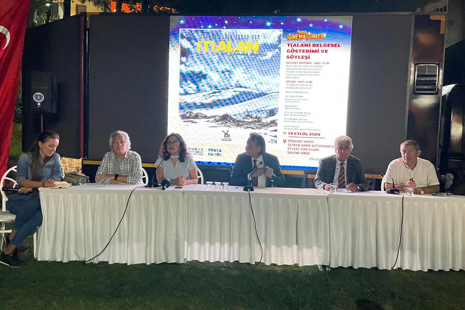 Kentin sadece salonlarının değil, meydanlarının, mahallelerinin ve sokaklarının da sanatın ışığı ile aydınlanması hedefiyle hareket eden Büyükşehir Belediyesi, bu kapsamda düzenlediği etkinliklere bir yenisini “Bursa Sinema Günleri” ile ekledi. Büyükşehir Belediyesi Kültür ve Sosyal İşler Dairesi Başkanlığı tarafından başlatılan ve Eylül ayı sonuna dek sürecek etkinliğin ilk gününde Bursa Muhalif Gazetesi imzalı (T)ALAN belgeseli gösterildi. Gökdere Vadisi Setbaşı Şehir Kütüphanesi Üftade Konferans Salonu girişinde düzenlenen açık hava etkinliğine, CHP Bursa Milletvekili Orhan Sarıbal, Bursa Kent Konseyi Başkanı Ertuğrul Aksoy, Kültür ve Sosyal İşler Dairesi Kültür Şube Müdürü Nazan Akdoğan, akademik odaların ve sivil toplum örgütlerinin temsilcileri, Bursa Muhalif Gazetesi ekibi ve Bursalılar katıldı. Bursa’nın hayat kaynağı olan Uludağ’ın “zaman”, “yaşam” ve “talan” üçgenindeki tarihsel serüvenini anlatan, Uludağ’ı korumak için verilen mücadeleyi mücadelenin aktörlerine anlattıran belgesel, ilgiyle izlendi.