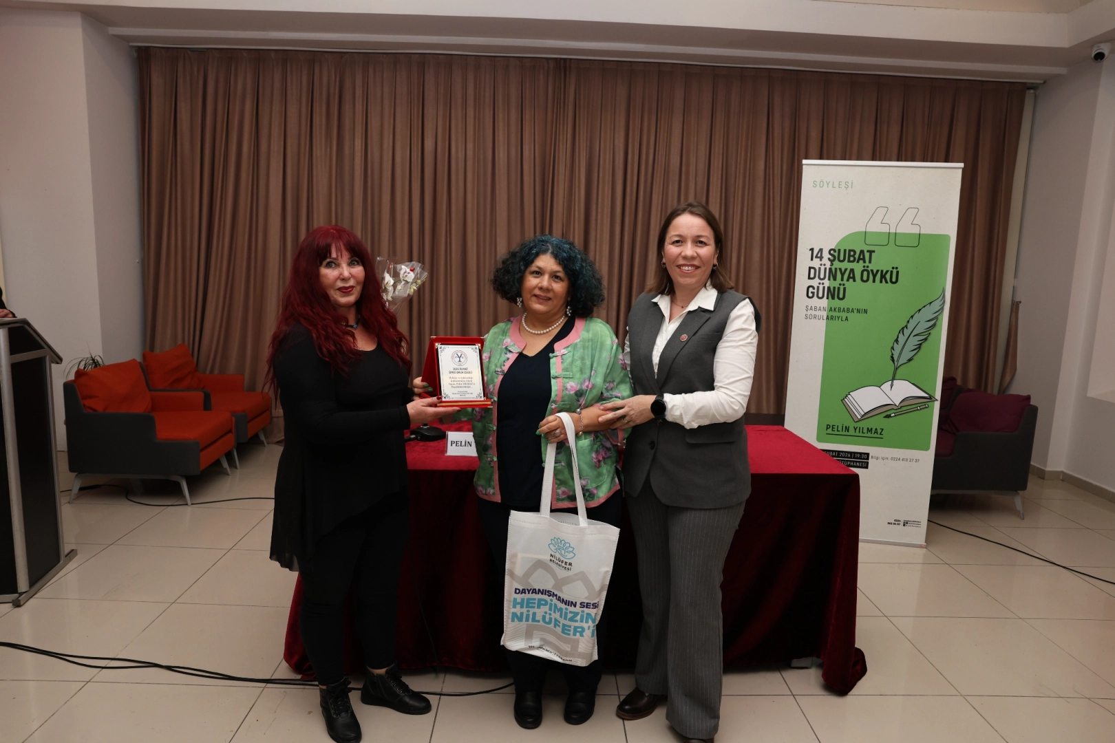 Söyleşinin ardından Nilüfer Belediyesi Meclis Üyesi Özlem Akbaş Önsoy, BUYAZ Yönetim Kurulu Üyesi Nursel Aras, Yazar Pelin Yılmaz’a plaket ve hediye takdim etti.