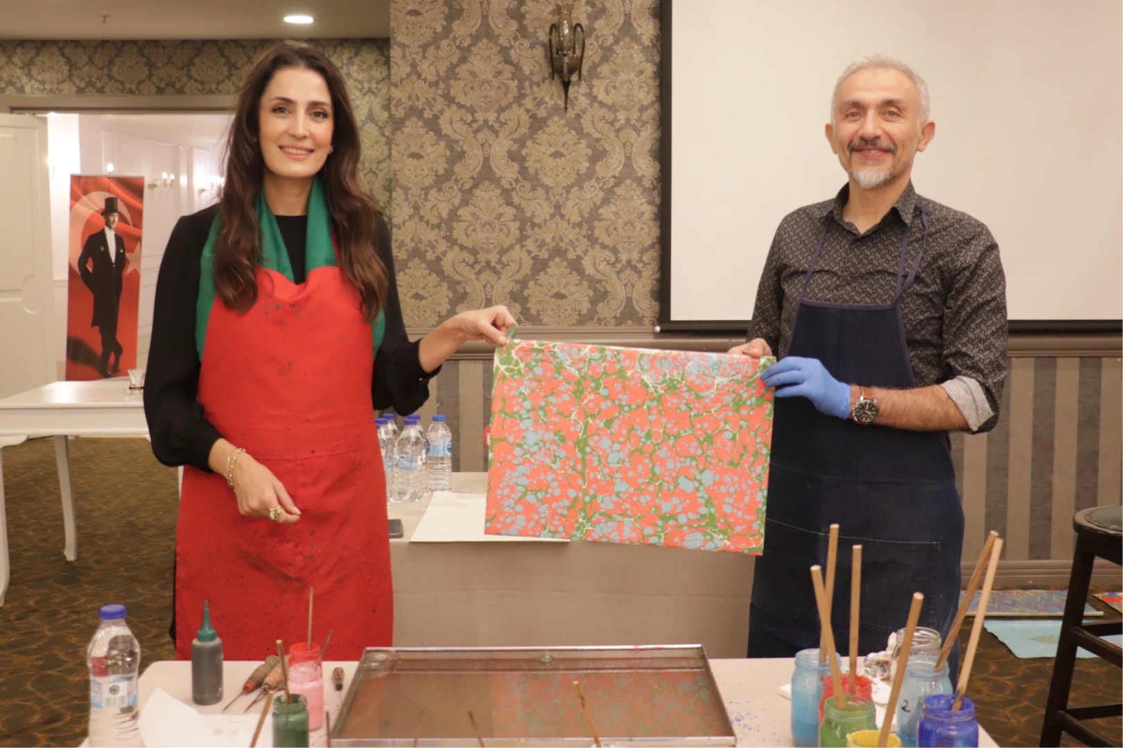 Konuşmaların ardından Prof. Dr. Hicabi Gülgen ve dernek üyeleri ebru sanatını birlikte icra ettiler. Hem Gülgen hem de annelerin yaptığı çalışmalar eğlenceli anların ortaya çıkmasını sağladı.