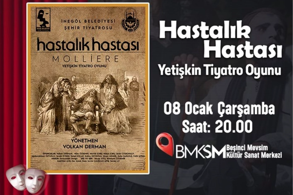İlk etkinlik 08 Ocak Çarşamba akşamı İnegöl’de kültür ve sanatın merkezi konumundaki Beşinci Mevsim Kültür Sanat Merkezinde düzenlenecek. İnegöl Belediyesi Şehir Tiyatrosunun yeni sezon oyunu olan ve ilk gösterimde ilçe halkının beğeniyle izlediği “Hastalık Hastası” isimli yetişkin tiyatro gösterisi, 20.00’da izleyici ile buluşacak. Ücretsiz biletsiz etkinlik için salon kapıları 19.00 itibariyle açılacak.